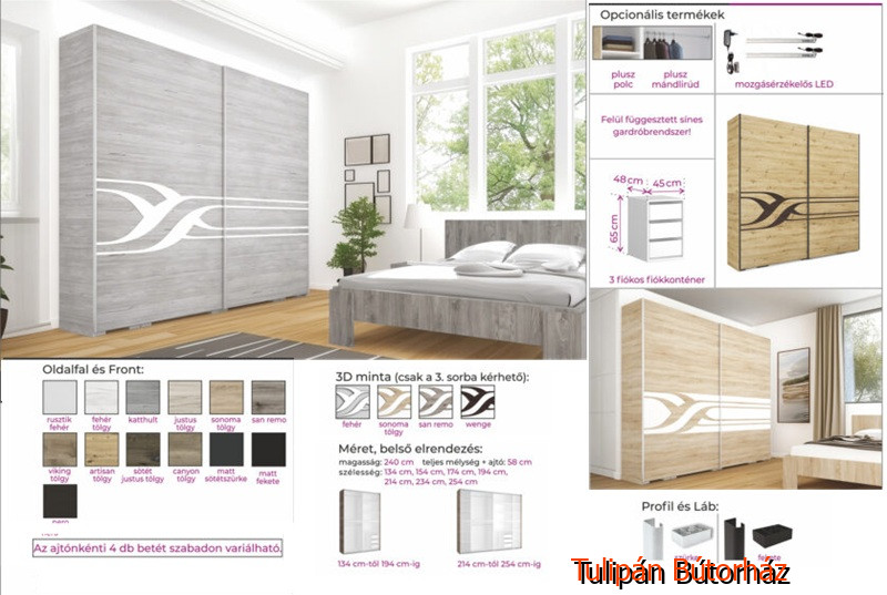 matt sötét szürke, katthult, sötét katthult, aristan tölgy, natúr tölgy, saltillo, justus tölgy, sonoma tölgy, san remo, nero, ferrara tölgy, rusztik fehér, avellino világos, avellino sötét, canterbury, iszap tölgy, arany tölgy, fehér tölgy, zebrano, krém sonoma, artisan tölgy, natúr tölgy, canyon tölgy, matt sötétszürke, matt fekete, viking tölgy... Frontja lehet még(pl: Bond...): magasfényű beige, -fehér,-antracit,-latte,-piros,-fekete.